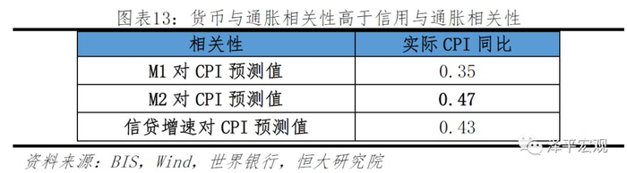我们通过建立线性回归方程,计算了我国2000年1月—2018年12月内M1、M2、信贷增速分别对CPI的预测值,结果显示:M2对20个月之后的CPI预测效果最好,预测值与实际值间的相关性为0.47,高于信贷增速对CPI的预测能力。