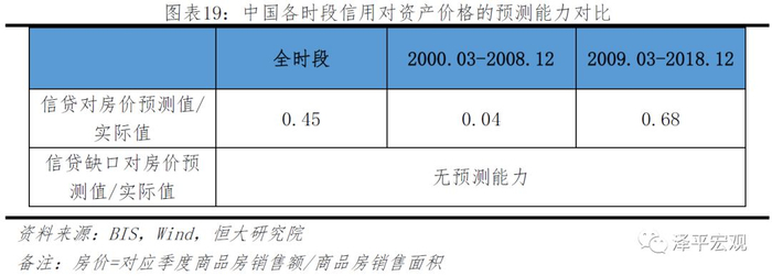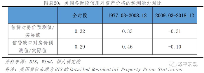 中国案例:金融危机后,信用对资产价格的预测能力加强。(1)贷款增速对于1个季度以后的房价同比预测效果最好,R方为20%,即贷款可以解释20%的房价同比变化;(2)进一步,我们将预测划分成2000年——2008年、2009年——2018年,计算信贷对房价的预测值与房价实际值之间的相关系数,发现金融危机后,贷款对房价的预测能力显著提升,两者的相关性高达0.68。