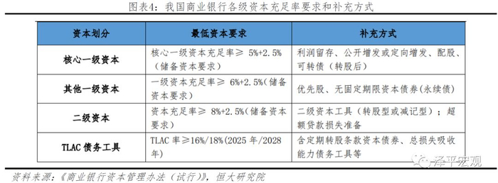 资本充足率可以进一步分为核心一级资本充足率、一级资本充足率和资本充足率。核心一级资本充足率的资本项仅来源于利润留存、股本增发和可转债转股,其他一级资本充足率的资本项可来源于优先股和永续债,资本充足率的资本项可以来源于二级资本债等形式。因此在不采用外部资本补充工具的情况下,利润留存是资本增长的唯一方式,从而限制银行资产扩张。