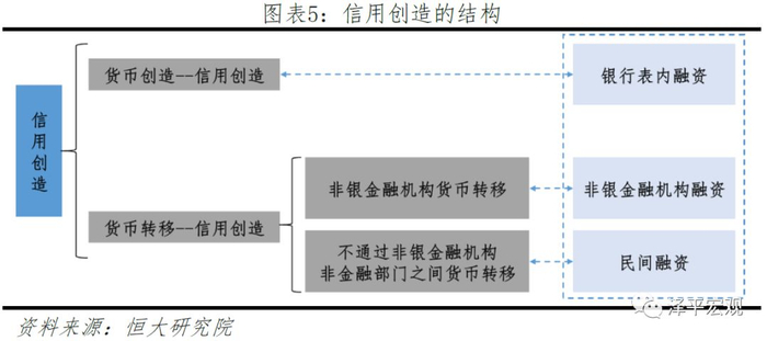 在信用货币时代下,随着货币的创造,信用随之产生。孙国峰(2015)曾对信用创造进行过详细论述,社会的信用创造活动主要有三部分构成,银行的信用货币创造、非银金融机构的货币转移、不通过非银金融机构的非金融部门之间的货币转移,对应银行融资、非银行金融机构融资和民间融资,前者为通过货币创造实现的信用创造,后两者为货币转移实现的信用创造。
