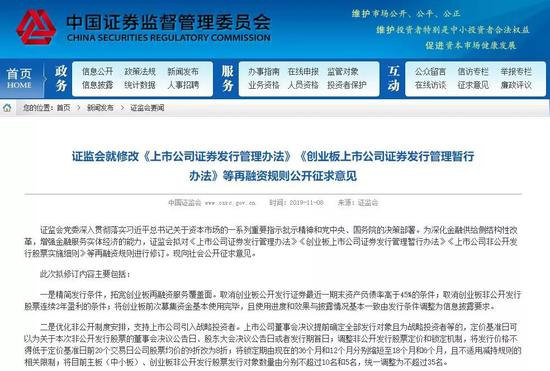 证监会相关部门负责人表示,现行再融资规则在规范上市公司证券发行行为,保护投资者合法权益和社会公共利益,尤其是在提高直接融资比重,支持实体经济发展,深化供给侧结构性改革,服务区域协调发展、绿色发展、“一带一路”、军民融合发展、国企改革等方面发挥着重要作用。目前,证监会正按照党中央的决策部署,积极落实设立科创板并试点注册制相关改革任务。为进一步提高再融资服务实体经济发展的能力,证监会拟按照注册制的理念,对现行再融资规则中制定时间较早、不能适应市场形势发展需要的部分规定进行调整,切实解决企业融资难、融资贵问题,积极支持上市公司充分利用资本市场做优做强,提高直接融资特别是股权融资比重。