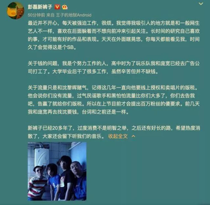 彭磊多次调侃去找沈黎晖讨薪未果,他也直接回应道,“我TM从来没欠过钱,所有版税都按照合约完全预付,清清楚楚。”