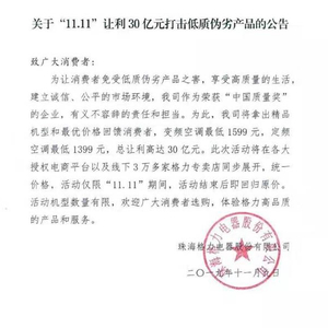 格力官方发布公告称,为让消费者免受低质伪劣产品之害,享受高质量的生活,建立诚信、公平的市场环境,为此公司将拿出精品机型和最优价格回馈消费者,变频空调最低1599元,定频空调最低1399元,总让利高达30亿元。此次活动将在各大授权电商平台以及线下3万多家格力专卖店同步展开,统一价格,活动仅限“11.11”期间,活动结束后即回归原价。