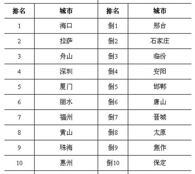 1-9月168个重点城市排名前10位和后10位城市名单。资料来源:生态环境部