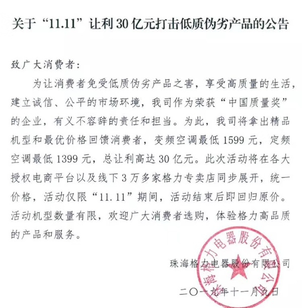 格力电器双11降价促销喊出让利30亿