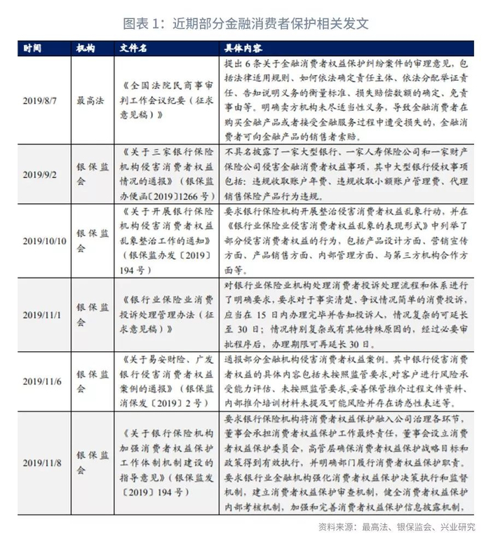 《指导意见》是银保监会近一个月来公开发布的第三份有关金融消费者权益保护的文件,随着资管产品转型的推进,金融监管部门将进一步加强金融消费者权益保护力度。此前,2019年10月10日,银保监会发布《关于开展银行保险机构侵害消费者权益乱象整治工作的通知》(银保监办发〔2019〕194号),要求银行保险机构开展整治侵害消费者权益乱象行动,限期要求各机构上报自查整改情况,并在《银行业保险业侵害消费者权益乱象的表现形式》中列举了部分侵害消费者权益的行为,包括产品设计方面、营销宣传方面、产品销售方面、内部管理方面、与第三方机构合作方面等。关于该文的具体分析请参见我们此前的报告《助力“破刚兑”,金融消保力度加强——银保监会开展侵害消费者权益乱象整治工作通知简评》[2]。2019年11月1日,银保监会发布《银行业保险业消费投诉处理管理办法(征求意见稿)》拟对银行业保险业机构处理消费者投诉处理流程和体系进行明确要求,要求对于事实清楚、争议情况简单的消费投诉,应当在15日内办理完毕并告知投诉人,情况复杂的可延长至30日;情况特别复杂或有其他特殊原因的,经过必要审批程序后,办理期限可再延长30日。与此同时,还明确银行保险机构处理消费投诉不利的,将受到相关监管处罚。除了以上发布的指导性文件,近期银保监会还公布了多起银行业、保险业机构侵害消费者权益的典型案例。这意味着监管部门已经打响了针对侵害金融消费者权益行为进行整治的“攻坚战”,未来金融消保的监管力度将进一步加强。