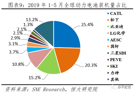 全球市场中本土动力电池厂商市场份额占比过半。据SNEResearch披露,2019年1-5月全球动力电池装机量TOP10企业分别为:CATL、松下、比亚迪、LG化学、AESC、国轩高科、三星SDI、PEVE、SKI、力神;前十名本土厂商占有五席,合计占据48.6%的市场份额,前五名本土厂商占有三席,CATL以25.4%市占率位列全球第一。
