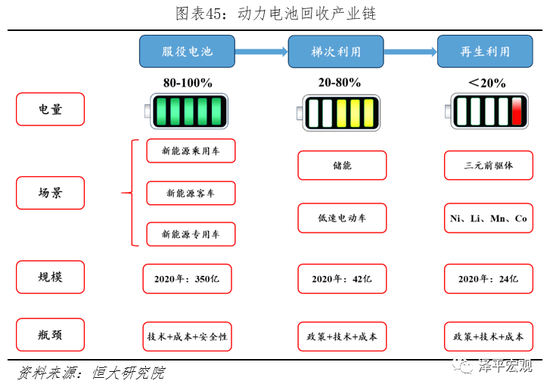 据中国汽车技术研究中心预测,至2020年我国动力电池累计退役量将达20万吨(约25GWh),至2025年累计退役量约78万吨(约116GWh),其中可进行梯次利用的约为55万吨,占总退役量70%。动力电池按照电量分为三个场景:1)服役状态,使用时间较短,实际容量衰减较轻,可达额定容量80%及以上;2)梯次利用,使用时间较长,实际容量衰减严重,在额定容量20-80%之间,仍具有使用价值,用于储能和低速电动车领域;3)再生利用,实际容量低于额定容量20%,使用价值低,安全隐患大,只能破碎再生回收贵金属。