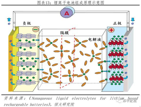 锂离子电池主要由四大原材料组成,分别是:正极、负极、隔膜、电解液。如图所示,充电时Li+从正极脱出,进入电解液中,嵌入负极,其中隔膜起着导通离子,阻隔电子的作用;反之放电时Li+从负极脱出,经电解液嵌入正极。