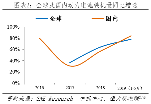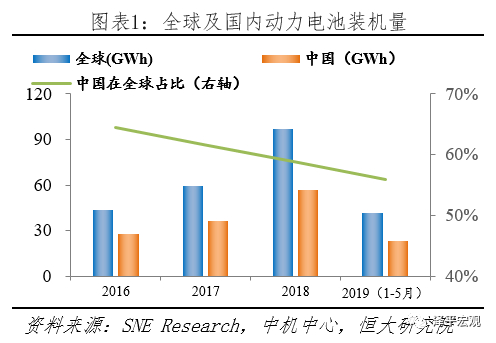 受益新能源汽车产销规模扩大及单车带电量提升,动力电池市场保持高速增长,未来仍有较大发展空间。2019年1-5月国内市场动力电池装机量23.4GWh,同比增长83.9%。按照2025年新能源汽车产量590万辆测算,动力电池需求量将达到330.6GWh,约为2018年装机量的6倍。