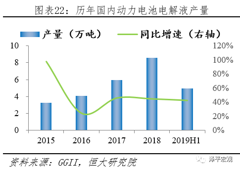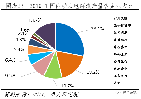 在新能源汽车产业带动下,动力电池电解液行业保持高速增长。电解液号称锂离子电池的“血液”,导通电池正负极,对锂离子电池的工作温度、循环效率、安全性能、倍率性能等影响重大。据GGII披露,国内动力电池电解液产量从2015年3.26万吨,增长到2018年8.59万吨,年复合增长率38.12%。2019上半年国内动力电池电解液产量4.95万吨,同比增长42.67%;前9名市场份额稳定,由高到低分别是广州天赐、深圳新宙邦、江苏国泰华荣、东莞杉杉、珠海赛纬、汕头金光、香河昆仑、天津金牛、山东海容;前三名合计占比57%,超过一半。