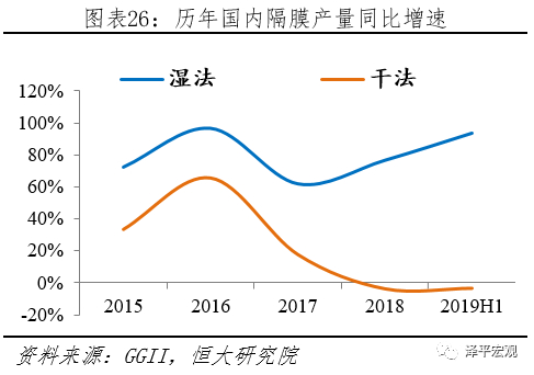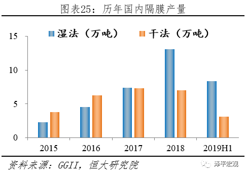 湿法隔膜是当前主流,占比逐年提升。据GGII披露,2019上半年我国隔膜总产量11.5万吨,其中湿法、干法分别生产8.39、3.11万吨,同比增速93.54%、-3.74%。从趋势上看,湿法隔膜市场占比逐年提升,从2015年38.05%增加到2019上半年72.96%。在动力电池领域,湿法隔膜在性能和安全性上有着超越干法的显著优势,更能够适应当前动力电池高能量密度化发展趋势。