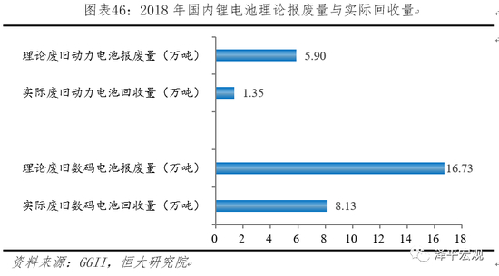 目前动力电池回收率不到1/4。庞大的数量让退役动力电池的回收成为不可忽视的问题,如不能妥善处理,不仅会带来巨大的环境污染、安全隐患,还会导致镍、钴、锂等贵金属资源的大量浪费。对此,政府非常重视,仅2018年工信部就发布了4项动力电池回收相关政策,例如发布首批“动力电池回收白名单”。但是我国锂离子动力电池回收占比仍然较低。据GGII统计,2018年我国实现废旧动力电池回收1.35万吨,实际回收比只有22.9%。
