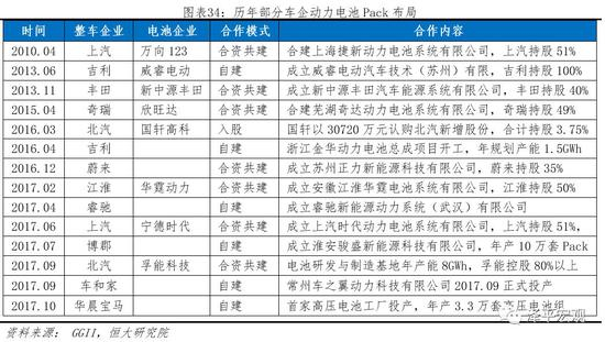 整车厂纷纷切入Pack领域。一方面,由于Pack的定制化属性,在市场竞争加剧的情况下,整车厂切入Pack领域,可有效提升电池安全性和整车竞争力;另一方面,在补贴退坡背景下,车厂降成本意愿强烈,切入Pack领域,可有效降低成本。因此上汽、北汽等整车厂纷纷布局Pack业务,例如上汽在2010、2017年分别与万向123、CATL合资共建Pack公司,皆持股51%。