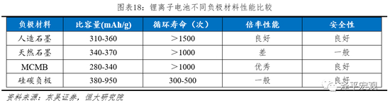锂离子电池负极材料主要有人造石墨、天然石墨、中间相碳微球(MCMB)、硅碳负极四种。其中MCMB由于克容量较低、生产过程需要消耗大量有机溶剂,且成品率很低,导致成本偏高,应用有限。硅碳负极比容量最高,但是循环、倍率性能差,尚待改进;天然石墨容量密度比人造石墨高,但是循环、倍率性能较差;综合比较,人造石墨性能最优。