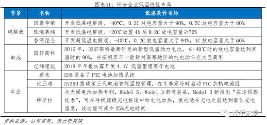 各企业布局低温改性技术,改善电动车冬季续航。电解液厂国泰华荣针对性开发低温电解液,公司搭载该款电解液电池产品,-40°C、0.2C放电容量大于90%,0.5C放电容量大于80%。电池厂国轩高科,针对高寒低区开发的低温动力电池,-40℃放电容量可达到常温90%。整车厂蔚来、比亚迪等在其最新车型均搭载智能温控系统,在低温下启动PTC加热电池组。