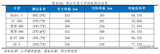 低温不仅降低材料的反应活性,而且会造成电解液凝固、离子迁移率降低、极化电压增大等。应用到动力电池,低温就会造成:1)放电容量降低(部分Li+来不及反应);2)倍率性能下降(电解液接近凝固,离子迁移率下降);3)放电平台降低(电池阻抗增加,极化电压增大)。根据部分代表车型冬季续航测试结果可以发现,在0℃左右的情况下,电动车续航会下降20-30%左右。