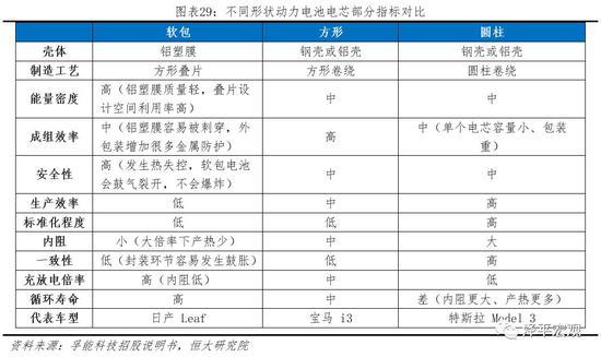 三种形状电池各有优劣,其中软包电池在能量密度、安全性、倍率性能方面优势突出,但是生产效率低,产品一致性差,价格昂贵;方形电池成组效率高,综合性能好,工艺成熟,但是安全性差、标准化程度低,能量密度偏低等问题突出;圆柱电池虽然工艺成熟,一致性高,但是电池内阻大、倍率、循环性能差,单个电芯容量小成组效率低。