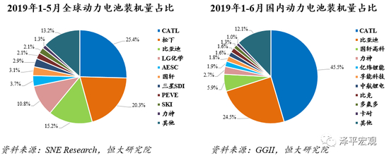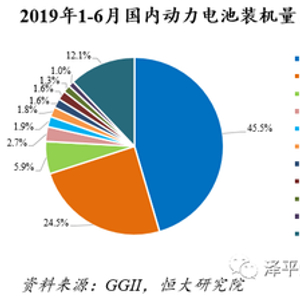 国内市场中本土厂商占据绝大多数市场份额。由于财政补贴、动力电池白名单等限制,外资在国内装机量很低。据GGII统计,2019年上半年国内动力电池装机量TOP10企业分别为CATL、比亚迪、国轩高科、力神、亿纬锂能、中航锂电、比克、多氟多和卡耐,皆为本土厂商,合计占据87.9%的市场份额。