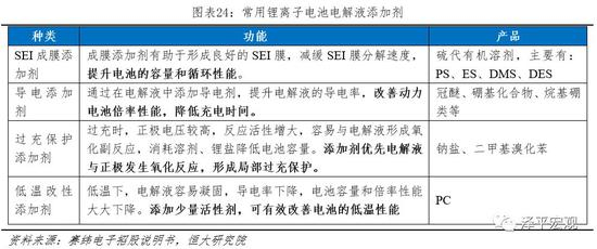 添加剂是电解液企业核心竞争力。电解液由溶剂、锂盐、添加剂三部分组成,其中溶剂、锂盐成分稳定,分别是DMC和LiFP6,添加剂品种多样,是企业核心技术竞争力。常用电解液添加剂主要有四种:SEI成膜添加剂、导电添加剂、过充保护添加剂、低温改性添加剂,对应提升动力电池的循环、倍率、安全、低温性能。