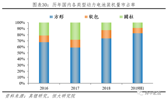 方形动力电池是当前市场主力,占比超过八成。据真锂研究统计,2019年上半年国内动力电池装机量29.80GWh,其中方形、软包、圆柱动力电池装机量分别为24.56、2.60、2.65GWh,对应占比82.4%、8.7%、8.9%。从趋势上看,方形占比持续提升,从2016年67.60%提升到2019H1的82.4%。因沃特玛“爆雷”,圆柱占比在2017年之后急剧缩小。