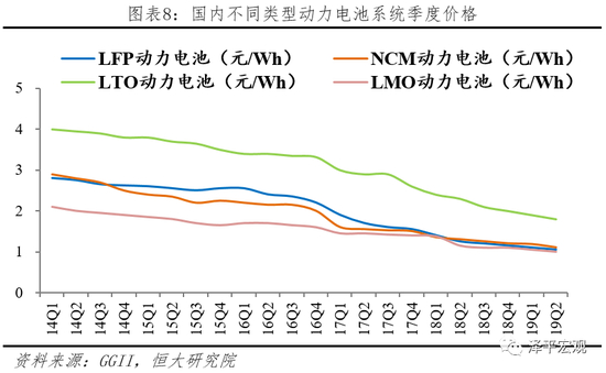 在竞争加剧、补贴退坡、规模效应等因素共同作用下,电池价格快速下降,部分已接近1元/Wh。目前国内动力电池系统按照材料体系划分主要有磷酸铁锂(LFP,正极材料)、三元镍钴锰(NCM,正极材料)、钛酸锂(LTO,负极材料)、锰酸锂(LMO,正极材料)四种。据统计,2014年第一季度LFP、NCM、LTO、LMO动力电池Pack售价分别为2.80、2.90、4.00、2.10元/Wh,截止到2019年第二季度售价分别下降到1.05、1.10、1.80、1.00元/Wh,对应下降幅度62.5%、62.0%、55.0%、52.4%。