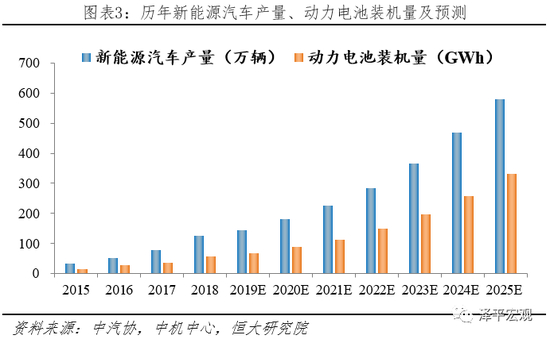 行业仍有很大发展空间。按照2025年新能源汽车产量590万辆测算,动力电池需求量将达到330.6GWh,相比2018年57.07GWh,对应年复合增速为28.52%。