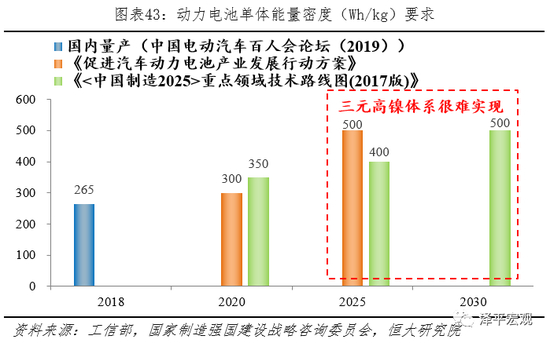 为此,政府先后出台多项文件对动力电池能量密度提出规划。2017年2月,工信部联合其他部委发布《促进汽车动力电池产业发展行动方案》指出,到2020、2025年,动力电池单体比能量分别达到300、500Wh/kg;2018年1月,国家制造强国建设战略咨询委员会发布《<中国制造2025>重点领域技术路线图(2017版)》指示,到2020、2025、2030年单体能量密度分别达到350、400、500Wh/kg。2019年1月工信部苗圩部长在“中国电动汽车百人会论坛(2019)”上披露,截止到2018年底我国量产的动力电池单体能量密度已达到265Wh/kg,基本达成2020目标。