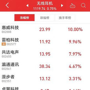 早盘TWS耳机概念股逆势大涨,板块指数逆势上涨0.75%。