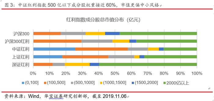 中证红利指数市值更偏中小风格。截至2019年11月6日,中证红利指数成分股中总市值在500亿及以下个股合计权重接近60%,其中,100亿及以下个股权重在25%以上,相较于其他红利宽基指数,中证红利指数市值更偏中小风格。