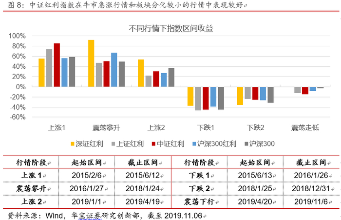 分区间来看。中证红利指数在2015年和2019年的牛市急涨行情中均跑赢上证红利指数和沪深300红利指数,在2016至2018年初的震荡攀升行情中,由于板块之间的分化较大,中证红利指数涨幅落后于沪深300红利指数,但仍然跑赢上证红利指数。在下跌行情及2019年4月下旬以来的震荡下跌行情中,中证红利指数的回撤相对较高。
