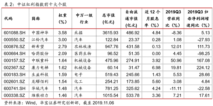 根据截至2019年11月6日的指数成分数据,中证红利指数前十大成分股包括4只上交所个股和6只深交所个股,主要分布在汽车、机械设备、采掘、农林牧渔和医药生物等板块,其中,康力电梯、龙蟒佰利、中国神华和华域汽车近12个月股息率在4%以上。