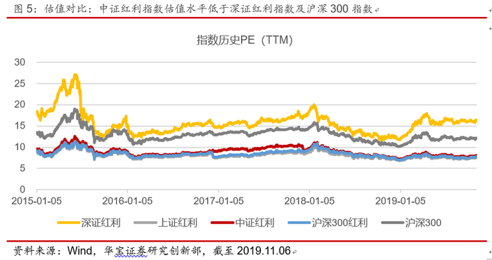 从估值数据来看,由于采用股息率加权,中证红利指数相比深证红利和沪深300指数具有明显的低估值特征,2019年以来指数整体PE水平略高于上证红利及沪深300红利指数,但差异不大。