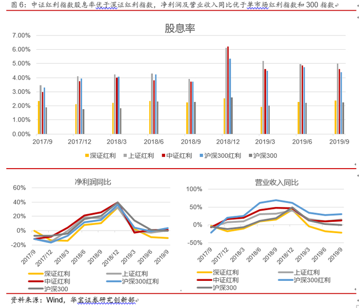 2017年底以来中证红利指数的股息率水平基本稳定在3%以上,相较于沪深300指数和深证红利指数,中证红利指数的股息率水平有明显提升,且2019年以来,中证红利指数的股息率水平高于沪深300红利指数。从盈利指标来看,2017年9月以来,中证红利指数的营收同比及归母净利润同比优于两只单市场红利指数。