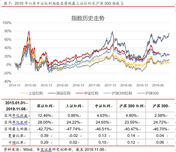 从历史数据来看,2015年以来中证红利指数累计年化收益4.63%,显著跑赢同期的沪深300指数和上证红利指数,夏普比率和卡玛比率有明显改善。2017年以来深证红利指数的强势上涨主要受益于分化行情下食品饮料和家电板块的拉升,这一阶段行业配置较为均衡的中证红利指数涨幅相对落后,但仍然跑赢上证红利指数。