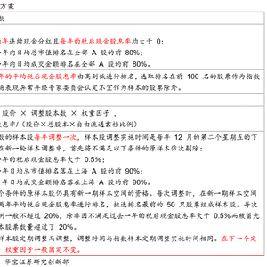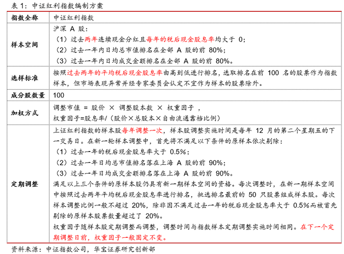 中证红利指数以沪深A股中现金股息率高、分红比较稳定、具有一定规模及流动性的100只股票为成分股,采用股息率作为权重分配依据,以反映A股市场高红利股票的整体表现,具体编制方案如下表所示: