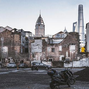 2017年10月,在上海外滩,一处正在拆闲的空地废墟与背景陆家嘴参天大楼的形成鲜明对比