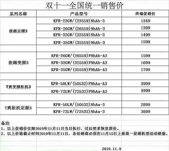 根据格力电器内部发布的双十一全国统一销售价格表来看,俊越定频系列以及俊越变频系列降价幅度最大,最低价格达到了1349元/台。界面新闻记者查询格力电器官方旗舰店后发现,俊越系列原价在3749元/台-2699元/台。