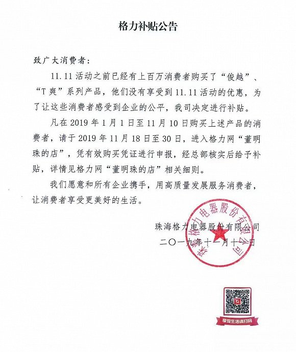 11月11日晚间,格力电器在其官方微信公众号发布公告称,“双十一活动之前已经有上百万消费者购买了‘俊越’、‘T爽’系列产品,他们没有享受到11.11活动的优惠,为了让这些消费者感受到企业的公平,我司决定进行补贴。”