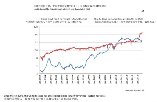 第十九张图表,美国的关税收入从2009年3月开始就已经逐渐超过中国,让我们看一下所谓的贸易战到底是什么,这张表可以说明问题,就是美国的收入主要是来自于关税,这是从2008年3月份开始美国关税的收入,2018年已经提到了贸易战,这是美国一些数据的表明。