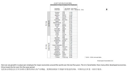 图七,这里显示的是过去五年全球各个主要经济体人均产出的增速,美国的表现要好于其他很多发达的经济体。但是,中国在这五年一直是居于榜首的。