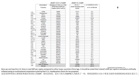 与此同时,我还想指出一点,、就是在这个表格当中的第二部分。再看一下美国和其他主要国家和地区的实际人均的GDP,美国和中国来讲,你会发现中国和美国GDP之和占到全球GDP的40%。