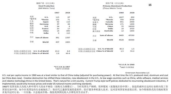 第十五张图表展示的是,1960年美国实际人均收入,和中国现在的水平相仿,当时美国主要生产钢材、铝和煤炭,跟现在的中国情况非常类似。创造性破坏让这些行业出现了转移,转向低工资国家,比如中国。如今在美国这些行业被淘汰了,取而代之的是蓬勃发展的软件业、医疗服务和机器人技术,这对于富裕国家是很自然的,如今特朗普式的关税政策,一旦实施只会提高价格,降低国民生活水准。
