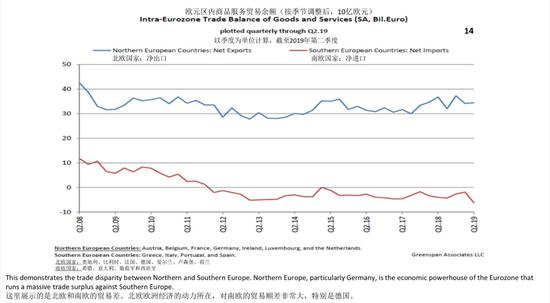 再看一下十四张图表,具体分析一下欧元区商品贸易额商品之间的关系,这是展示的是北欧和南欧之间的贸易差。北欧地区仍然是欧洲的经济动力所在,对南欧贸易顺差是非常大的,特别是德国。