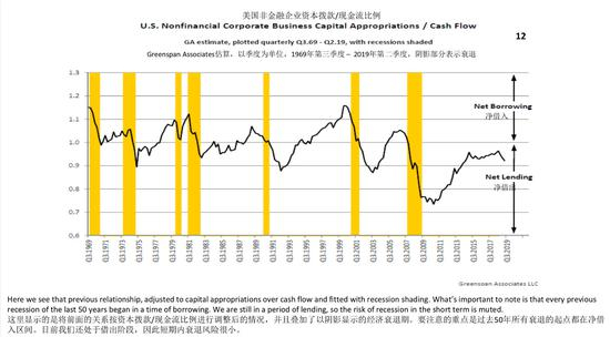 第十二张表,这体现了一个应变量,并且叠加了经济衰退期,在过去50年当中,所有衰退的起点都在净借入区间,目前我们还处于借出阶段,因此短期内衰退的风险是很小的。每周工业产值的差额在不断减小,还包括工业产品生产的数量也在缩小,但是现在还不能把它叫做是一个衰退的开始。毫无疑问的经济走弱,包括工业领域的一些变化,全球很多地区都出现了类似的情况。这里要回答的一个问题是,从这边到那边,也就是从现在到未来会有什么样的变化,等一下我会在提问的时间跟大家讲。