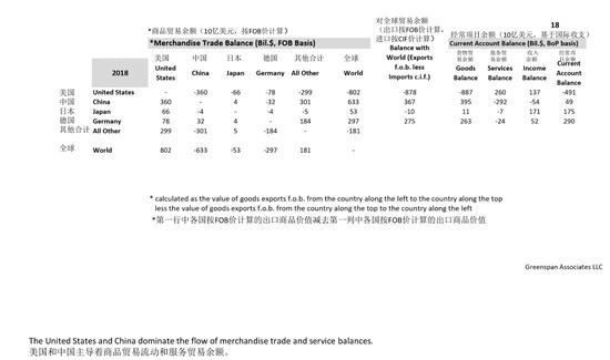 第十八张图表,这是两个最主要的国家,美国和中国,主导着商品贸易流动和服务贸易余额。