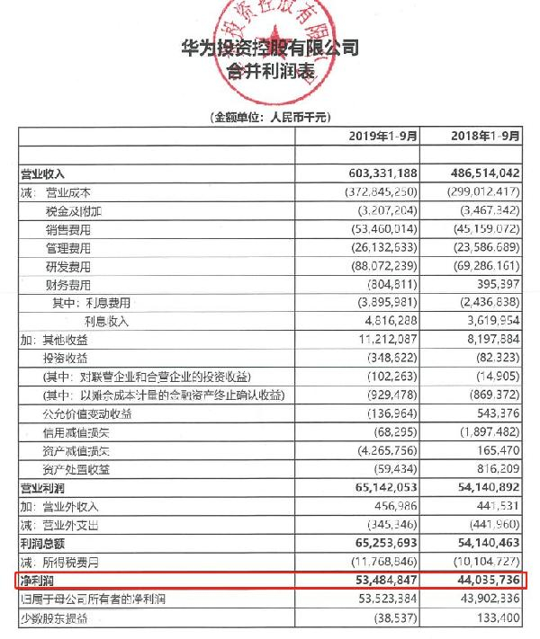 华为最新的三季报显示,今年前三季度华为实现营业收入6033亿元,同比增长24%,净利润达到535亿元,较去年同期的440亿元同比增长21.59%。