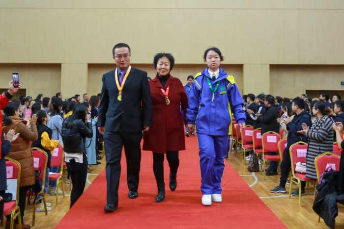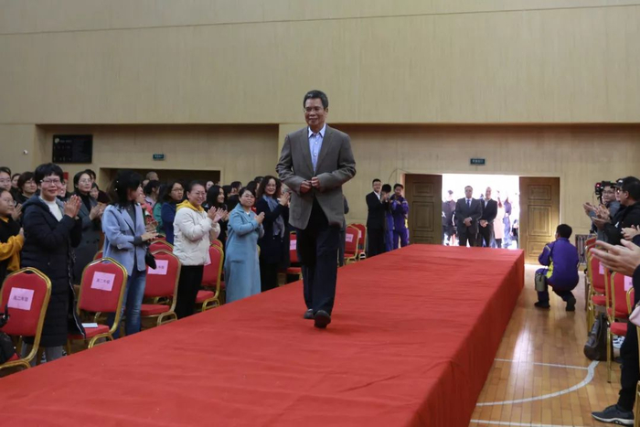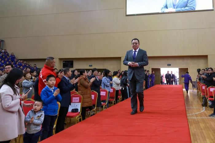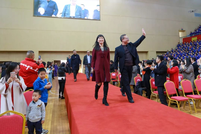 范守善院士、郎光辉先生、爱心企业家、校友会理事和三代一中人代表在全体师生的热烈欢迎下步入会场!