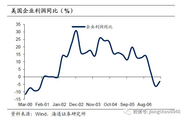 但通胀走高时期美国企业盈利维持高速增长,直到危机之后才大幅回落。由于本轮通胀是因为经济过热而引起,并且通胀处于相对温和的区间,因此在通胀攀升期间美国经济整体表现也非常好。受益于经济的持续繁荣,美国企业利润增速在2002年-2006年间一直处于10%以上的高位,部分月份甚至达到20%以上。而2007年次贷危机爆发以后,受到经济走弱的影响企业利润出现断崖式下降,并在2007年一季度到2009年二季度处于负增。