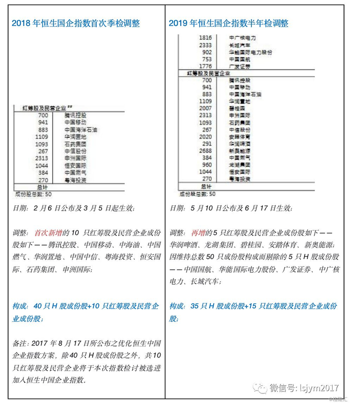 2018年2月,恒生指数公司首次正式对恒生国企指数进行重大调整,新增腾讯控股、中国移动等10只红筹股和民营企业成分股进入指数。2019年5月,再次实施改革:在维持50只成份股总数量不变的情况下,红筹股及民营企业成份股由10只增至15只,华润啤酒、碧桂园、安踏体育等优质公司进入指数。